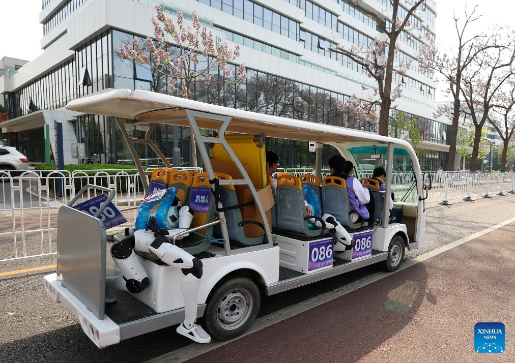 Humanoid robot "GRH150-001" (L) of Guijipaozhe Team in the remote-controlled category is carried on the support vehicle during the Beijing E-Town half-marathon and humanoid robots half-marathon in the Beijing Economic-Technological Development Area in southeast Beijing, China, April 19, 2026. (Xinhua/Luo Yuan)