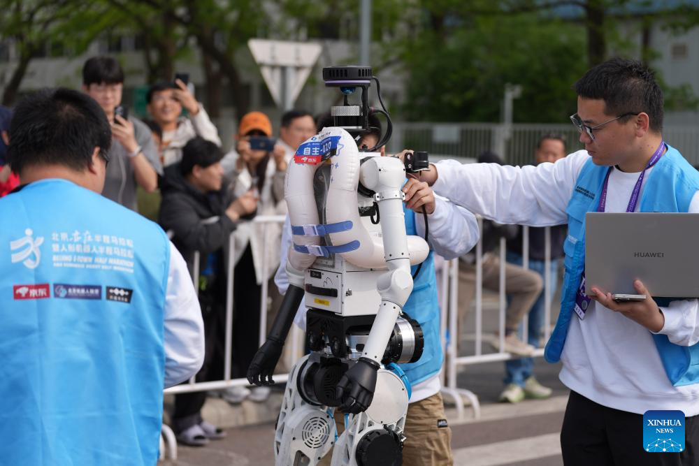 Engineers check the humanoid robot "Tiangong 3.0" (2nd L) of Zhipaozhe Team in the remote-controlled category during the Beijing E-Town half-marathon and humanoid robots half-marathon in the Beijing Economic-Technological Development Area in southeast Beijing, China, April 19, 2026. (Xinhua/Zhai Yifan)