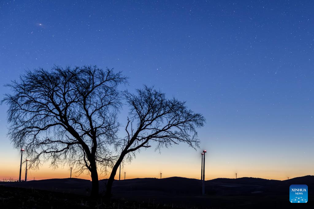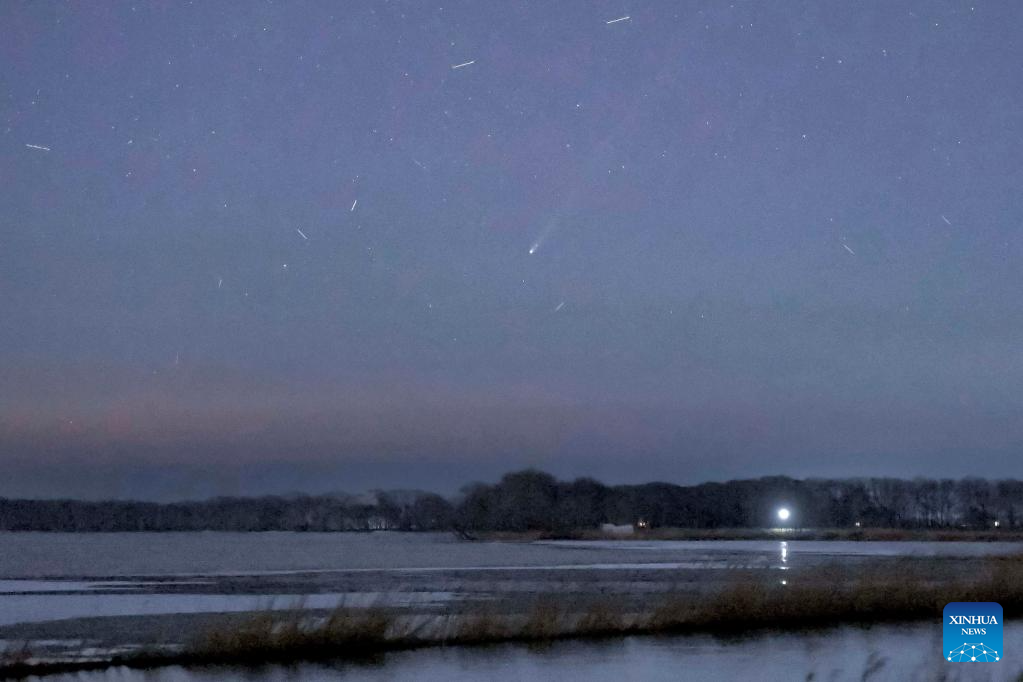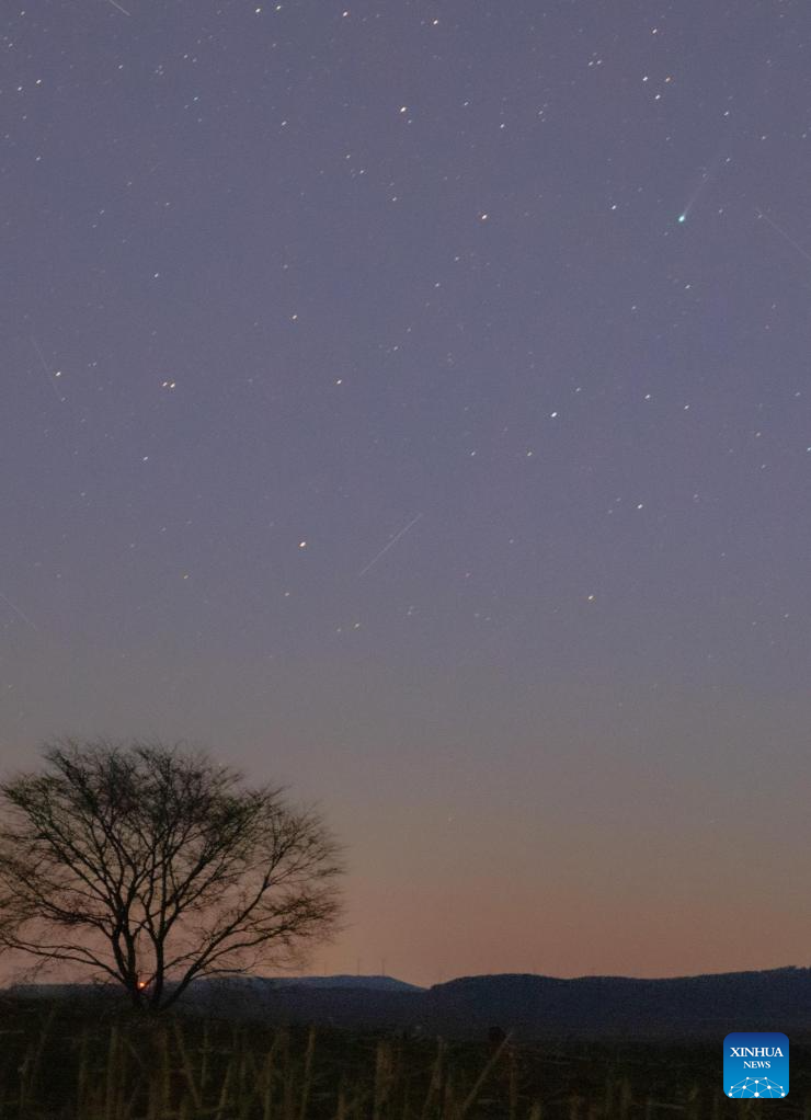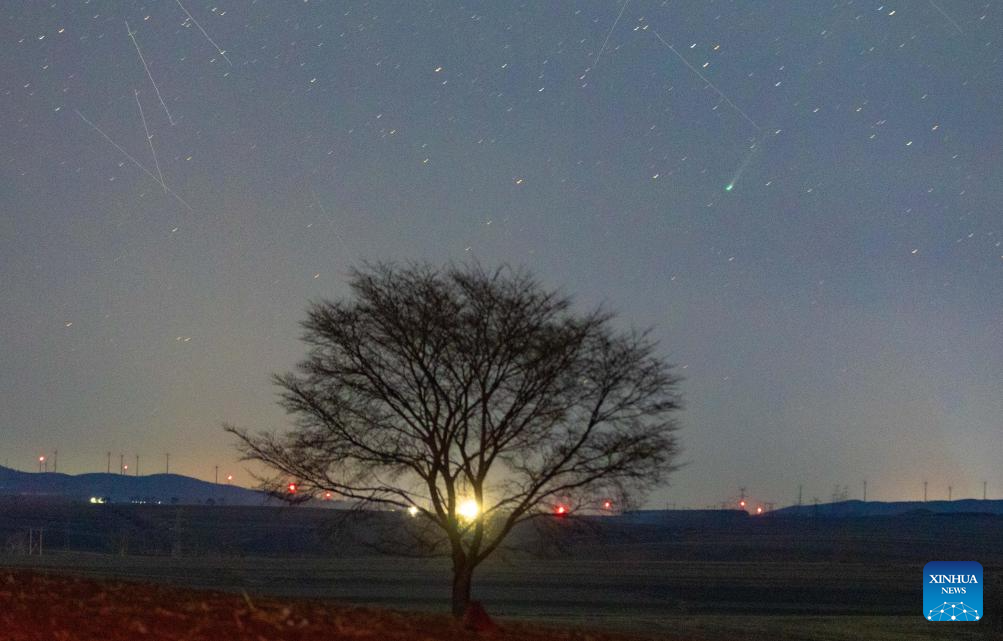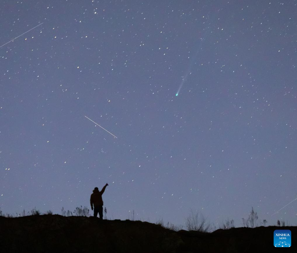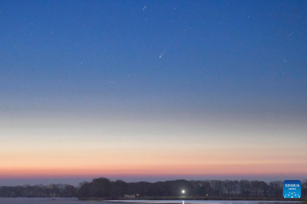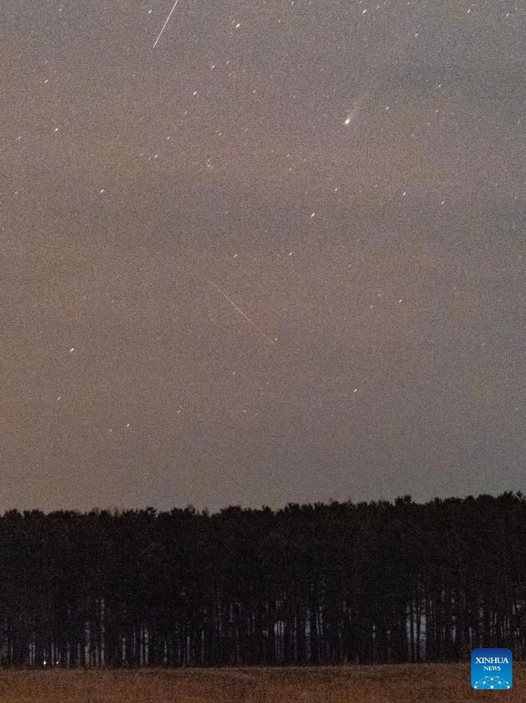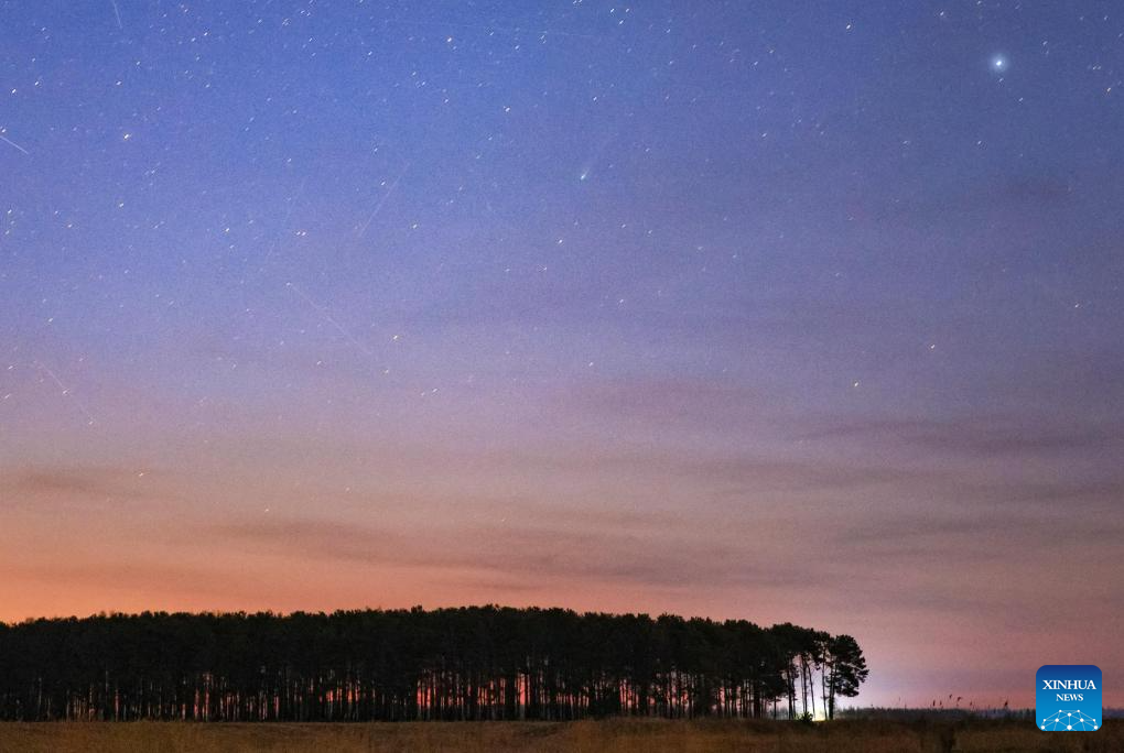 This photo taken on April 14, 2026 shows the comet C/2025 R3 in the sky over Huachuan County of Jiamusi City, northeast China's Heilongjiang Province. (Photo by Zhu Zongqiang/Xinhua)