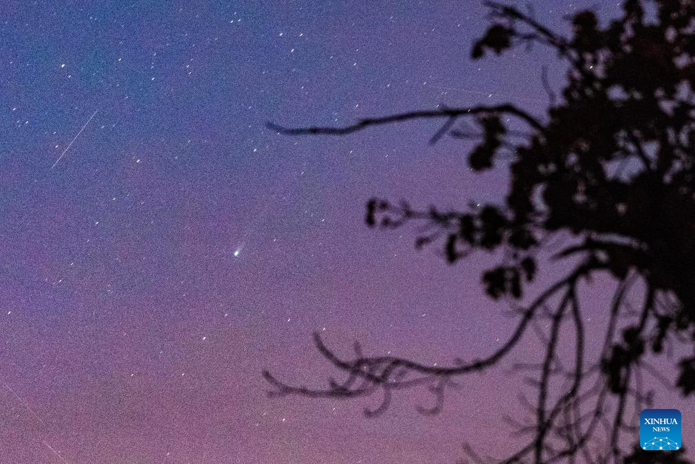 This photo taken on April 14, 2026 shows the comet C/2025 R3 in the sky over Shuangyashan City, northeast China's Heilongjiang Province. (Photo by Han Yang/Xinhua)
