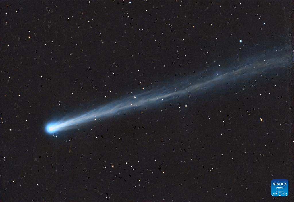This stack composite photo taken with an intelligent astronomical telescope shows the comet C/2025 R3 in the sky over Yichun City, northeast China's Heilongjiang Province on April 14, 2026. (Photo by Li Jiaxing/Xinhua)