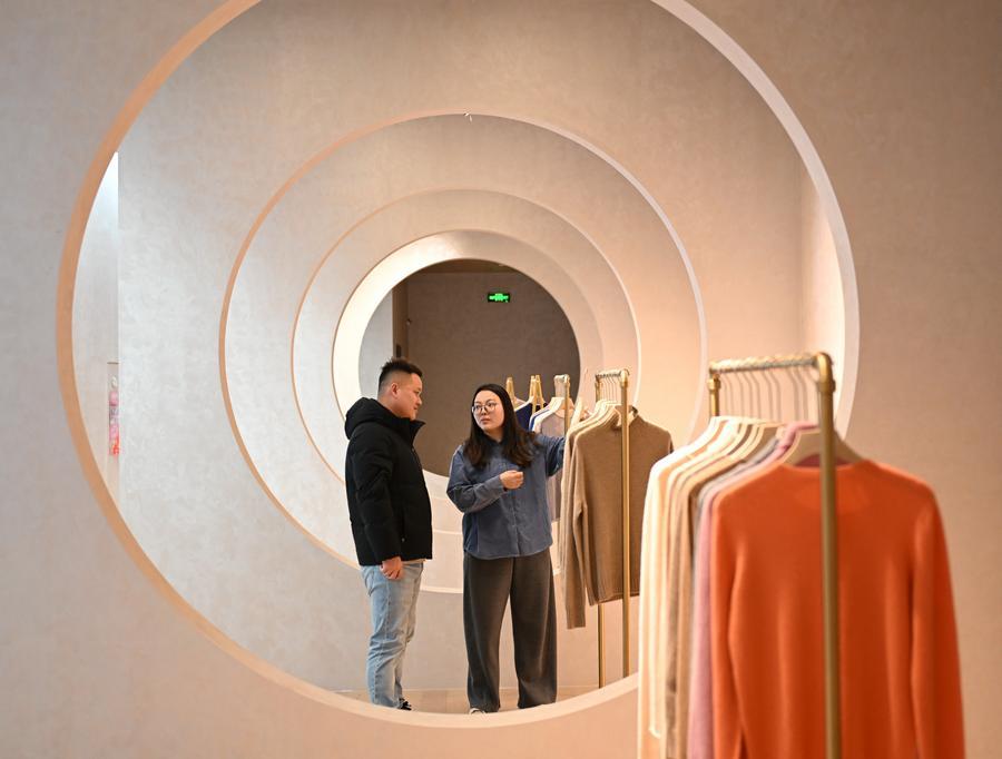 A staff member introduces cashmere sweaters to a customer at the exhibition hall of a cashmere products manufacturer in Qinghe County, Xingtai City, north China's Hebei Province, Jan. 18, 2025. (Xinhua/Mu Yu)