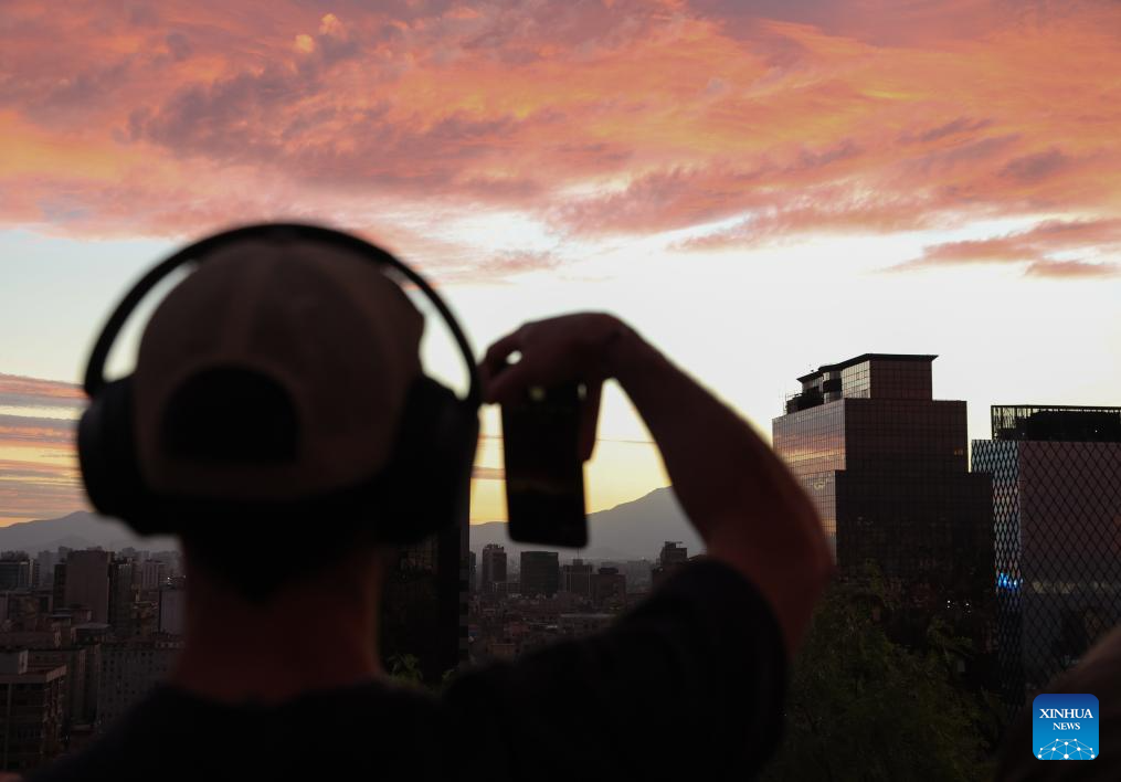 People enjoy the sunset glow at the Cerro Santa Lucía in Santiago, Chile, April 18, 2026. (Xinhua/Zhou Jiayi)