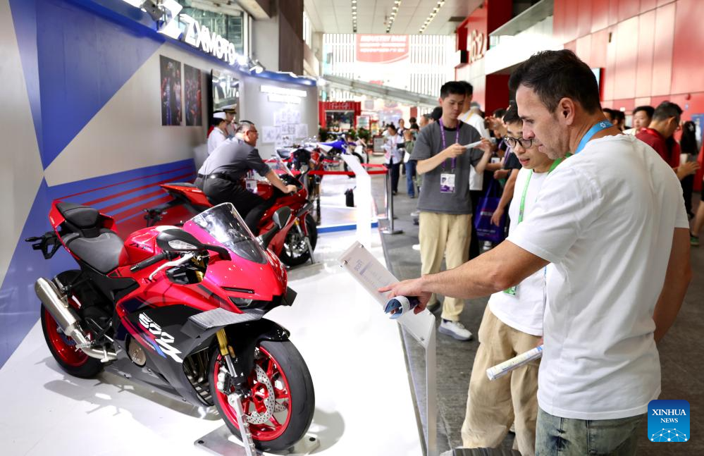 Visitors look at products of Chinese motorcycle maker ZXMOTO at the 139th edition of the China Import and Export Fair in Guangzhou, south China's Guangdong Province, April 17, 2026. The recent historic double victory by Chinese motorcycle maker ZXMOTO in the World Supersport category at the Portuguese round of the Superbike World Championship has drawn widespread attention. (Xinhua/Lu Hanxin)