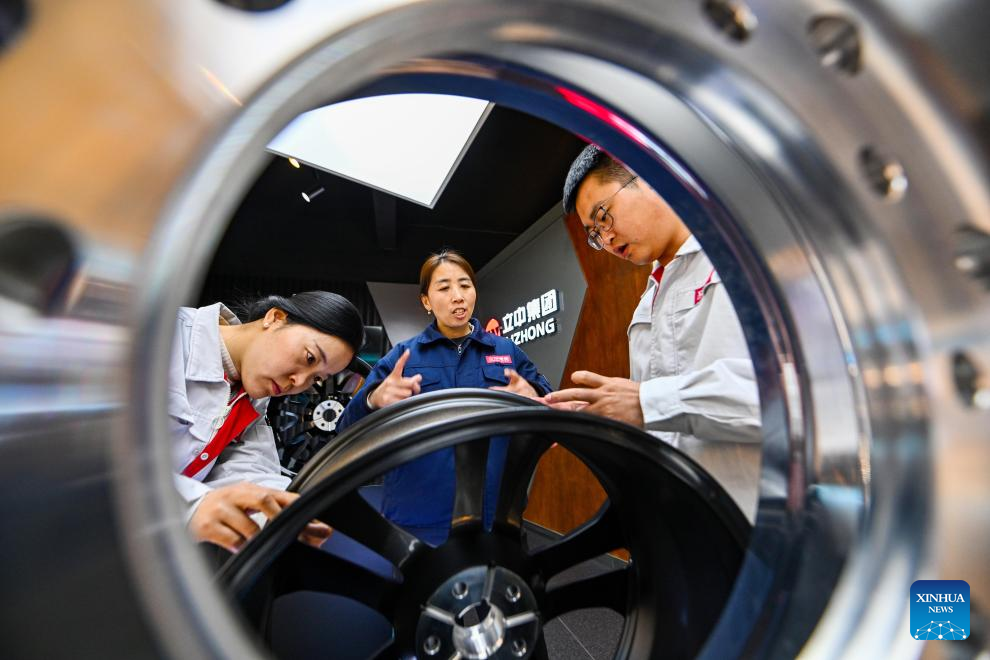 Guo Hongjing (C) talks with her colleagues at Tianjin Lizhong Wheel Co., Ltd. in north China's Tianjin, Feb. 25, 2026. (Xinhua/Zhao Zishuo)