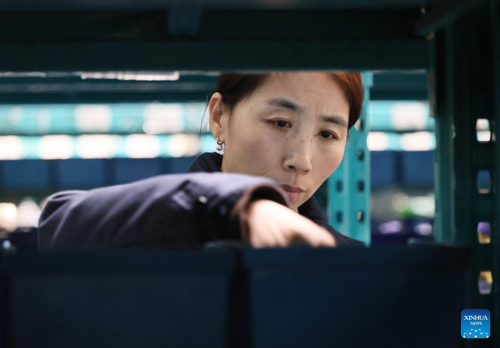 Guo Hongjing checks materials at Tianjin Lizhong Wheel Co., Ltd. in north China's Tianjin, Feb. 25, 2026. (Xinhua/Li Ran)