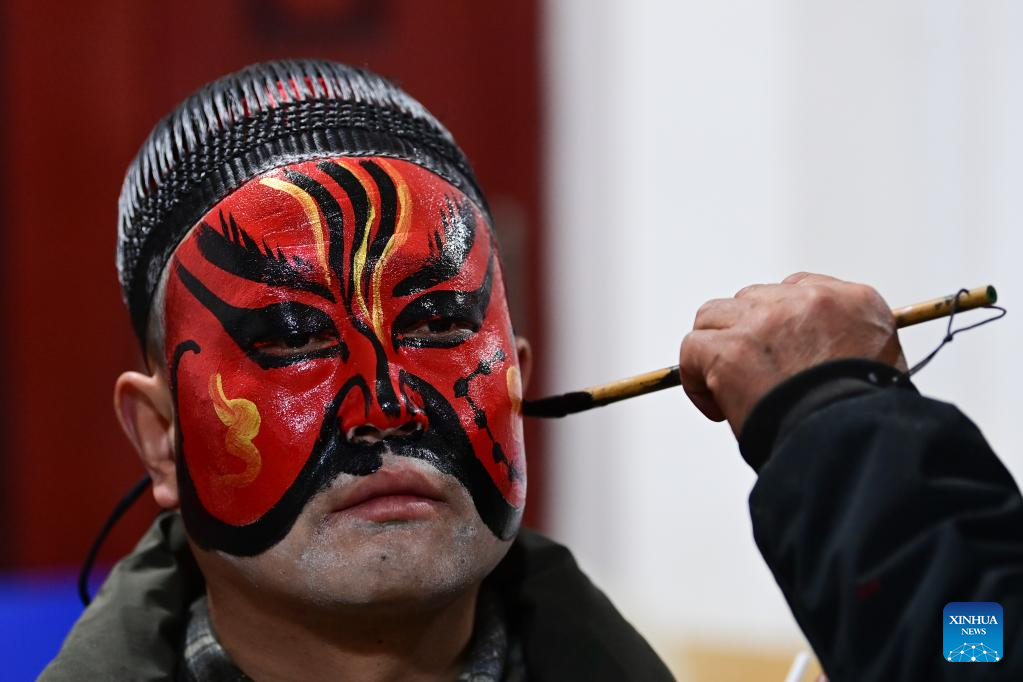 An elderly artist applies facial make-up for a Shehuo parade team member in Huanghuayu Village in Longxian County of Baoji City, northwest China's Shaanxi Province, in the early morning of March 2, 2026. (Xinhua/Zou Jingyi)
