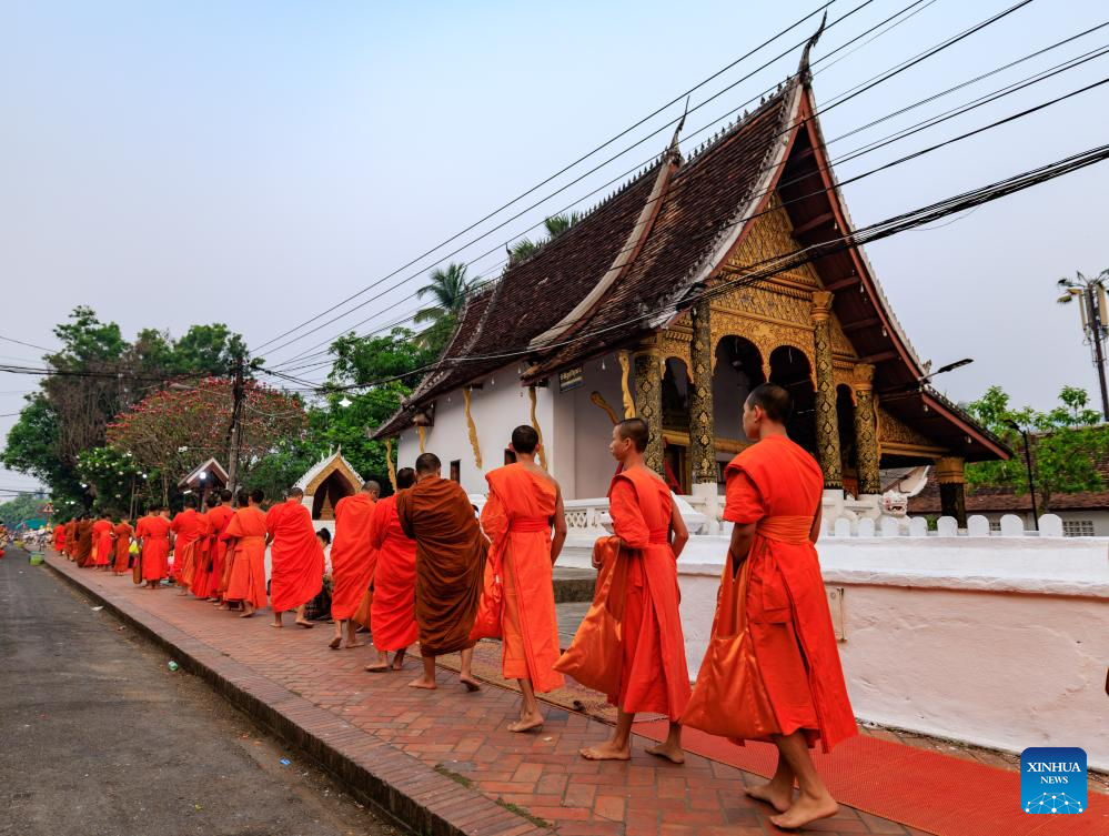 Monks attend the alms-giving activity in Luang Prabang, Laos, April 16, 2026. As dawn breaks over the ancient town of Luang Prabang, saffron-robed monks walk barefoot in procession along the streets to receive alms. Local residents and visitors by the roadside offer sticky rice and other food into the monks' bowls. (Xinhua/Chen Yichen)