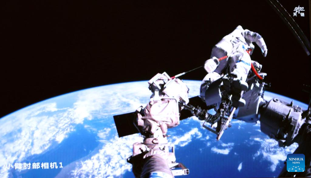 This screen image captured at Beijing Aerospace Control Center on April 16, 2026 shows Shenzhou-21 astronaut Wu Fei performing extravehicular activities (EVAs) outside China's orbiting space station. (Photo by Zhang Fan/Xinhua)