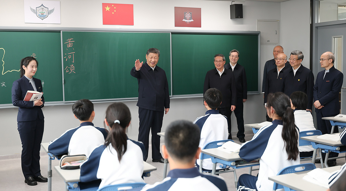 The Xiong'an campus of Beijing No. 4 High School, built with support from Beijing Municipality and put into use in August 2023, currently has more than 380 students. In the teaching building, where students were attending classes, Xi walked into the Seventh-Grade (Class 2) classroom, chatted with teachers and students, and learned about teaching conditions. He expressed hope that the school would bring over the successful experience and practices of Beijing No. 4 High School, care for students' physical and mental well-being with heartfelt dedication, and promote their all-round development.