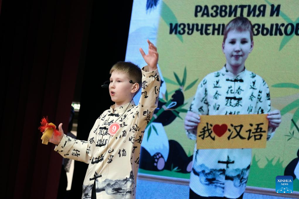 A contestant competes during a preliminary round of the sixth "Chinese Bridge" Chinese proficiency competition for foreign primary school students in Vladivostok, Russia, April 17, 2026. (Photo by Andrey Matveenko/Xinhua)