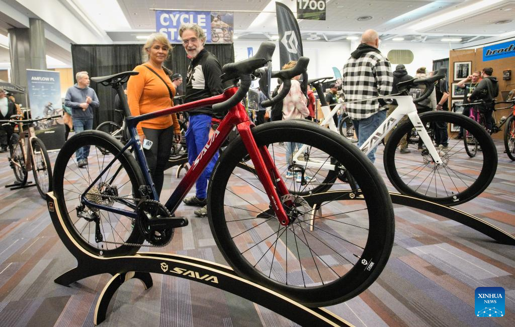 People look at a racing bicycle during the 2026 BC Bike Show in Vancouver, British Columbia, Canada, on Feb. 28, 2026. The two-day bicycle consumer show showcased the latest products from around 60 exhibitors. (Photo by Liang Sen/ Xinhua)