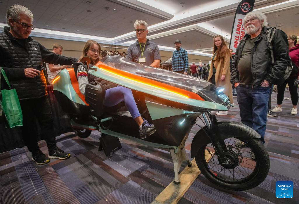 A woman sits in an electric-assist tricycle during the 2026 BC Bike Show in Vancouver, British Columbia, Canada, on Feb. 28, 2026. The two-day bicycle consumer show showcased the latest products from around 60 exhibitors. (Photo by Liang Sen/ Xinhua)