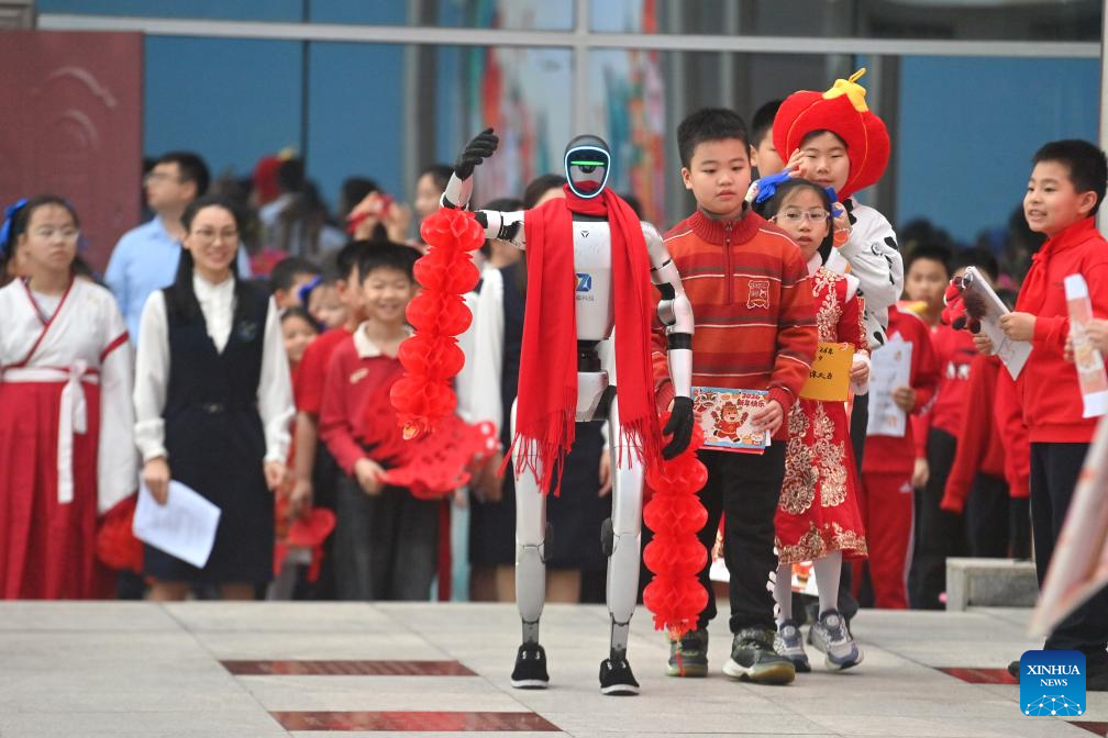 Students, along with a humanoid robot, offer Chinese New Year greetings at the opening ceremony for new semester at a primary school in Nanning, south China's Guangxi Zhuang Autonomous Region, March 2, 2026. A new semester kicked off for primary and secondary schools as well as kindergartens in many parts of China on Monday. (Xinhua/Huang Xiaobang)