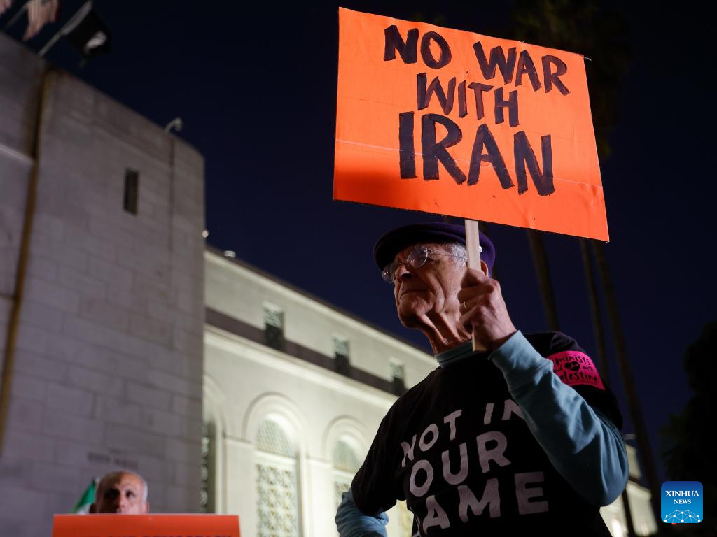 People protest against U.S. military attack on Iran in Los Angeles, the United States, on March 2, 2026. (Xinhua)