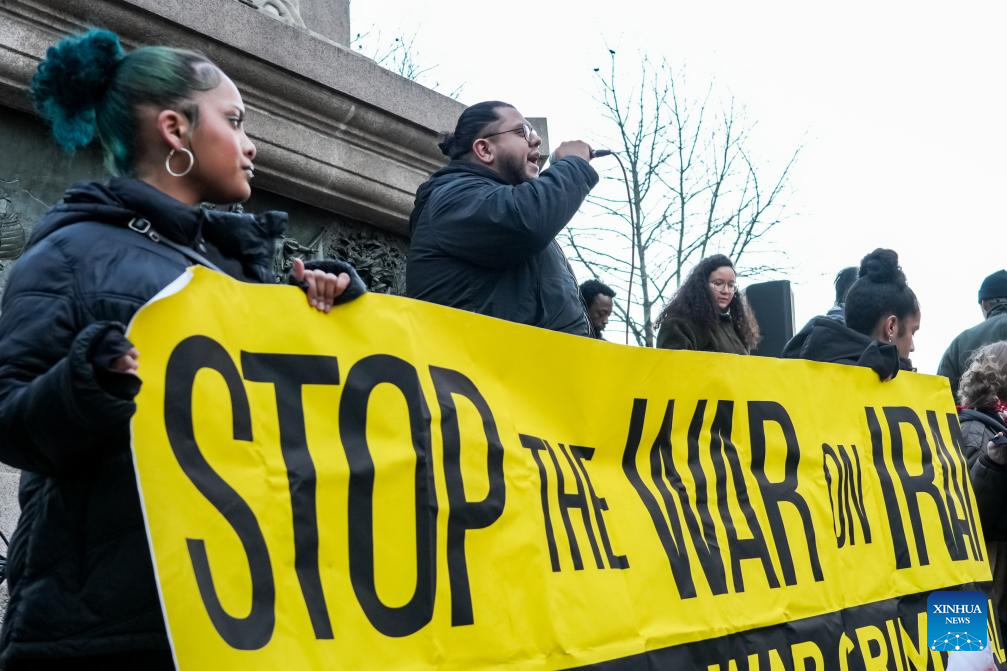 People protest against U.S. military attack on Iran in New York, the United States, on March 2, 2026. (Photo by Zack Zhang/Xinhua)