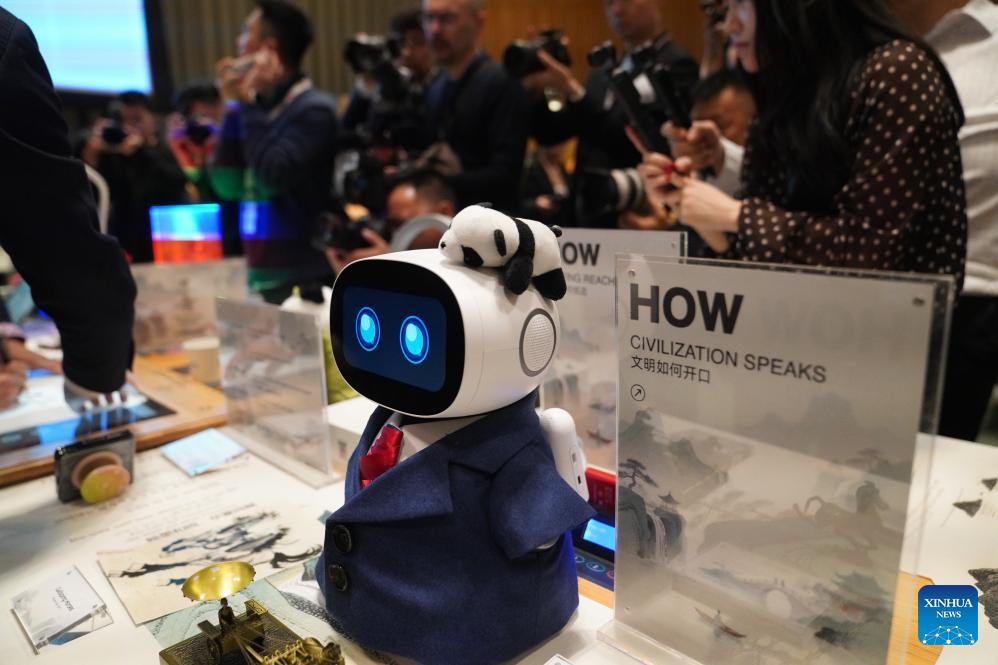 A guest interacts with an educational robot during a celebration marking the UN Chinese Language Day at the UN headquarters in New York, on April 13, 2026. A celebration titled Chinese Language Shining Civilizations was held at the UN headquarters in New York to mark the UN Chinese Language Day on Monday. (Xinhua/Zhang Fengguo)