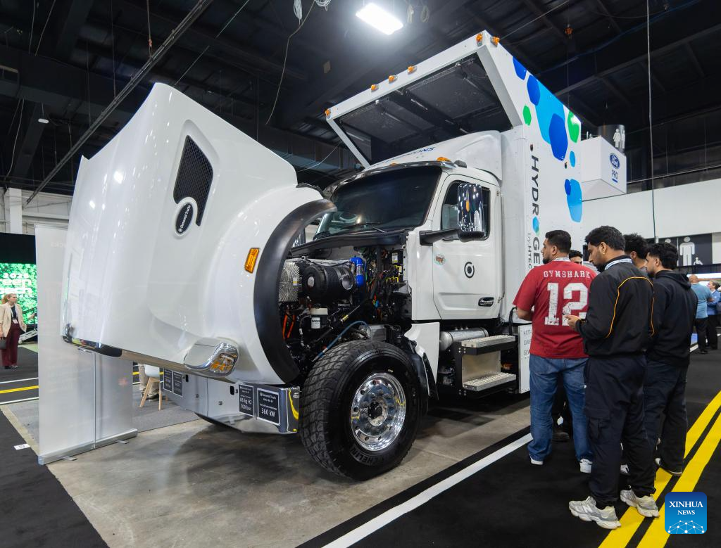 Participants view a hydrogen fuel cell electric truck during the Truck World 2026 in Mississauga, Ontario, Canada, on April 16, 2026.