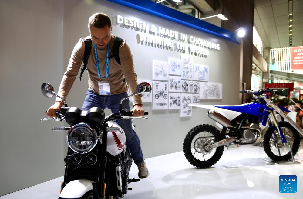 A visitor tries to ride a motorcycle of Chinese motorcycle maker ZXMOTO at the 139th edition of the China Import and Export Fair in Guangzhou, south China's Guangdong Province, April 17, 2026. The recent historic double victory by Chinese motorcycle maker ZXMOTO in the World Supersport category at the Portuguese round of the Superbike World Championship has drawn widespread attention. (Xinhua/Lu Hanxin)