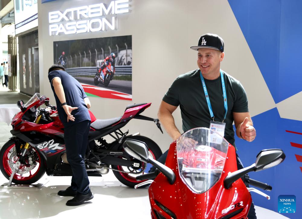Visitors look at products of Chinese motorcycle maker ZXMOTO at the 139th edition of the China Import and Export Fair in Guangzhou, south China's Guangdong Province, April 17, 2026. The recent historic double victory by Chinese motorcycle maker ZXMOTO in the World Supersport category at the Portuguese round of the Superbike World Championship has drawn widespread attention. (Xinhua/Lu Hanxin)