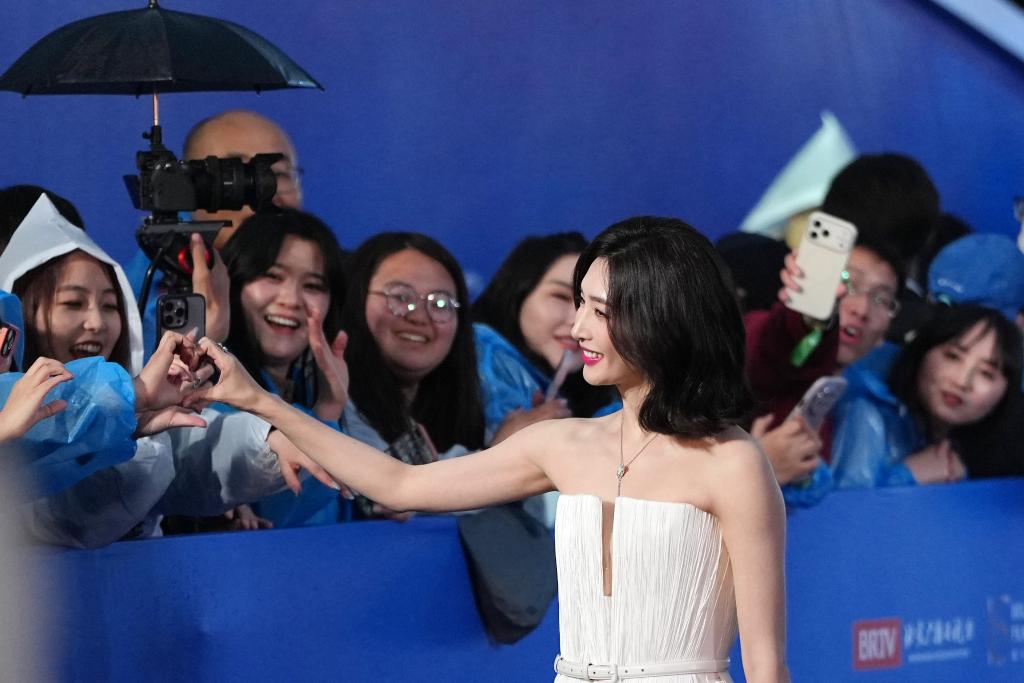 4月16日,演员江疏影在开幕红毯上与影迷互动。新华社记者 鞠焕宗 摄