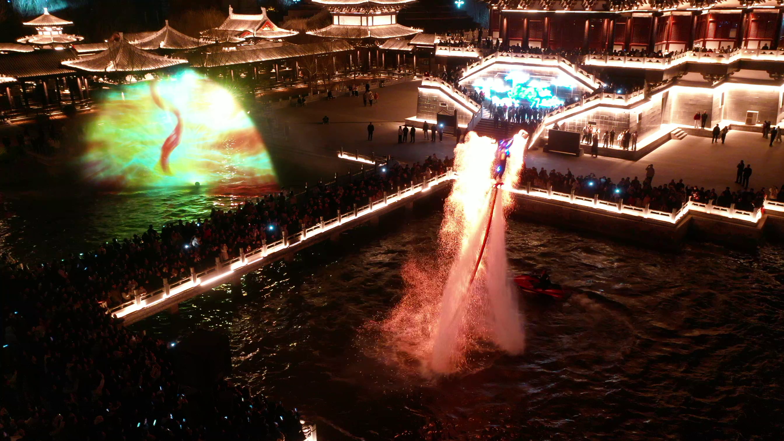 图为游客在大名宋街观看光影秀、火壶表演。新华网发