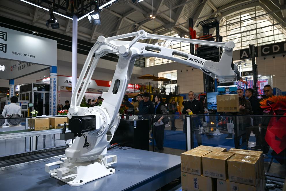 3月18日,一台搬运机械臂在天津工博会上向观众进行演示。