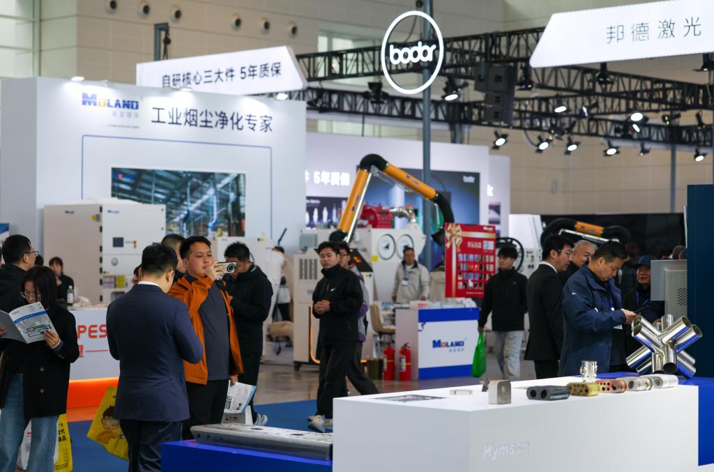 3月18日,观众在天津工博会上参观一款打磨工作站。