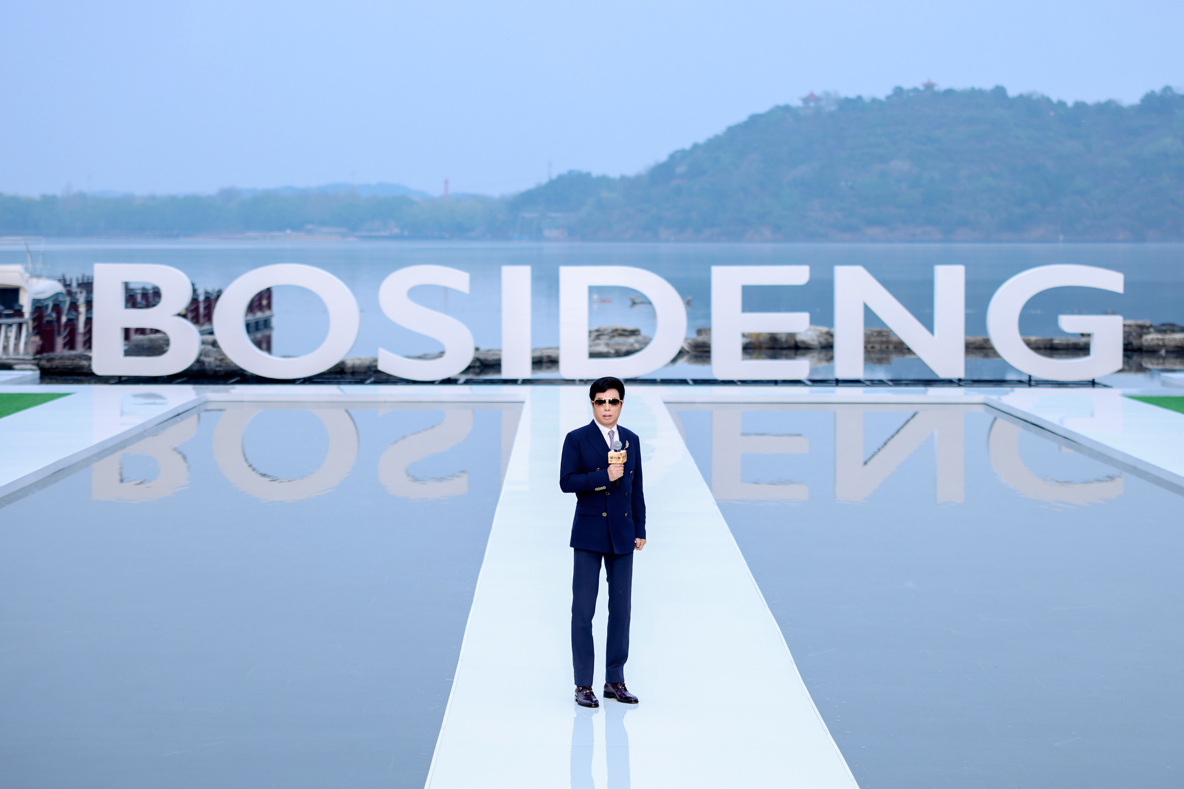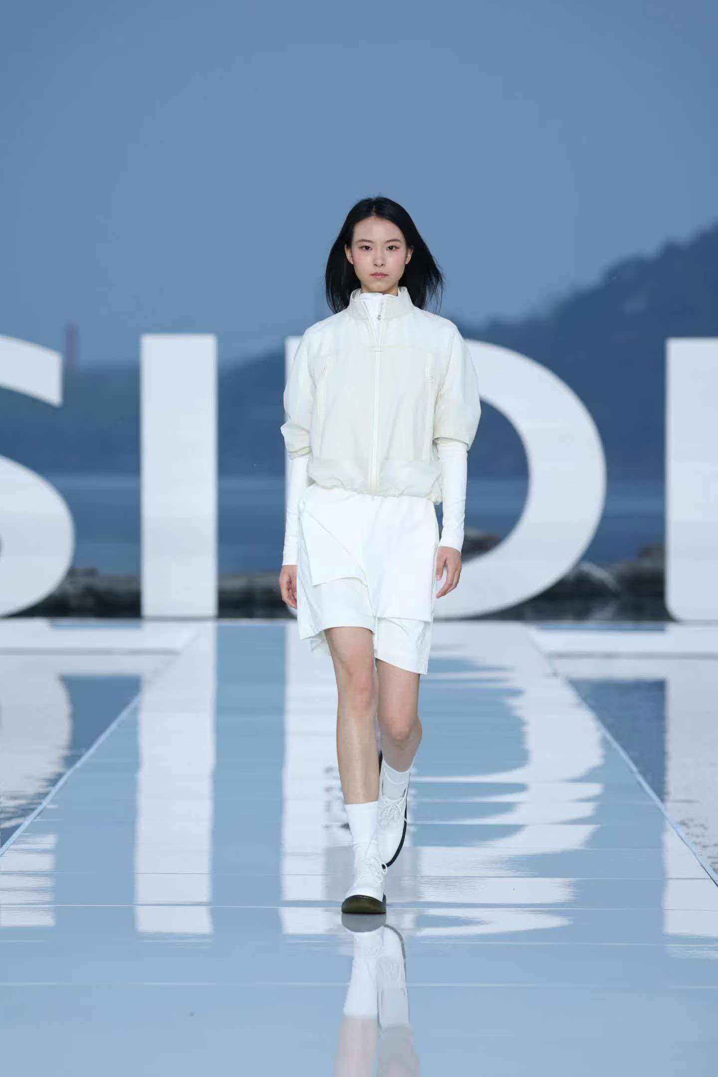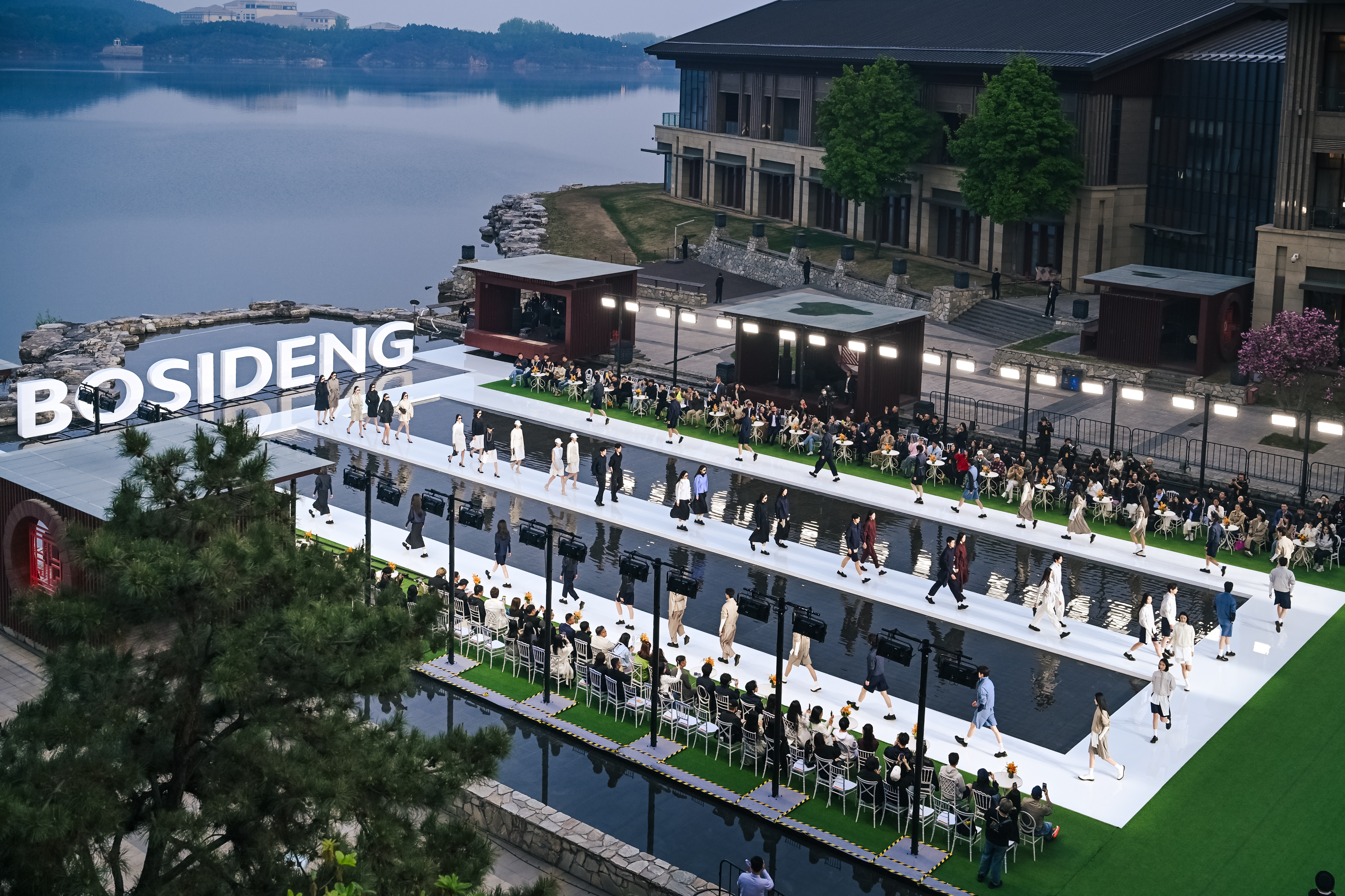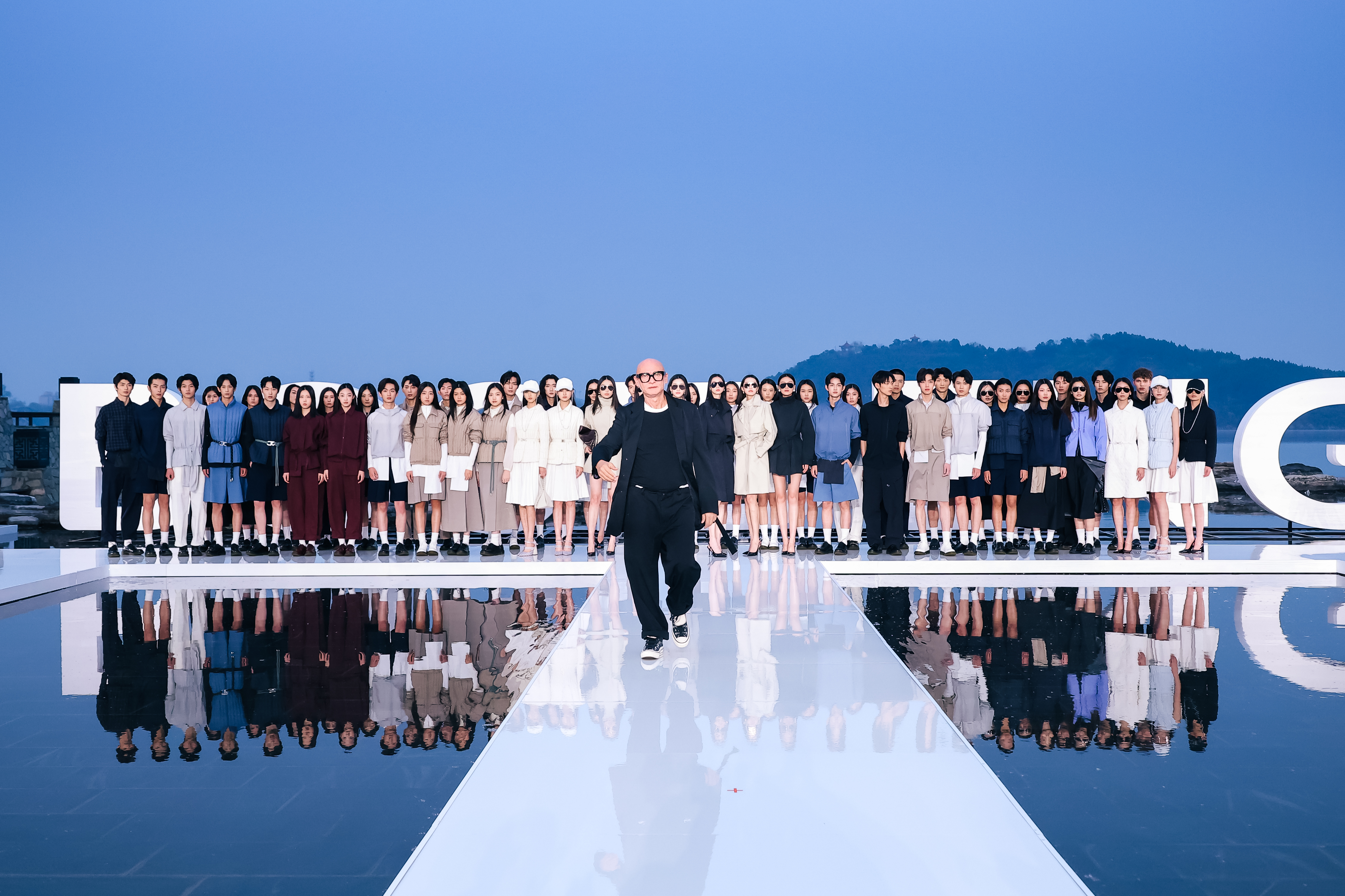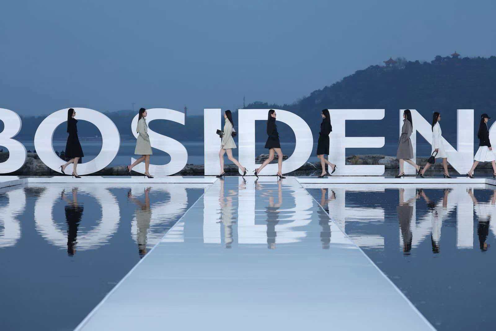 大秀选址雁栖湖畔,湖面波光、远山肌理、落日余晖与舞台背景浑然天成,将波司登本季产品“都市与户外无界切换”的理念化为沉浸式的感官体验。
