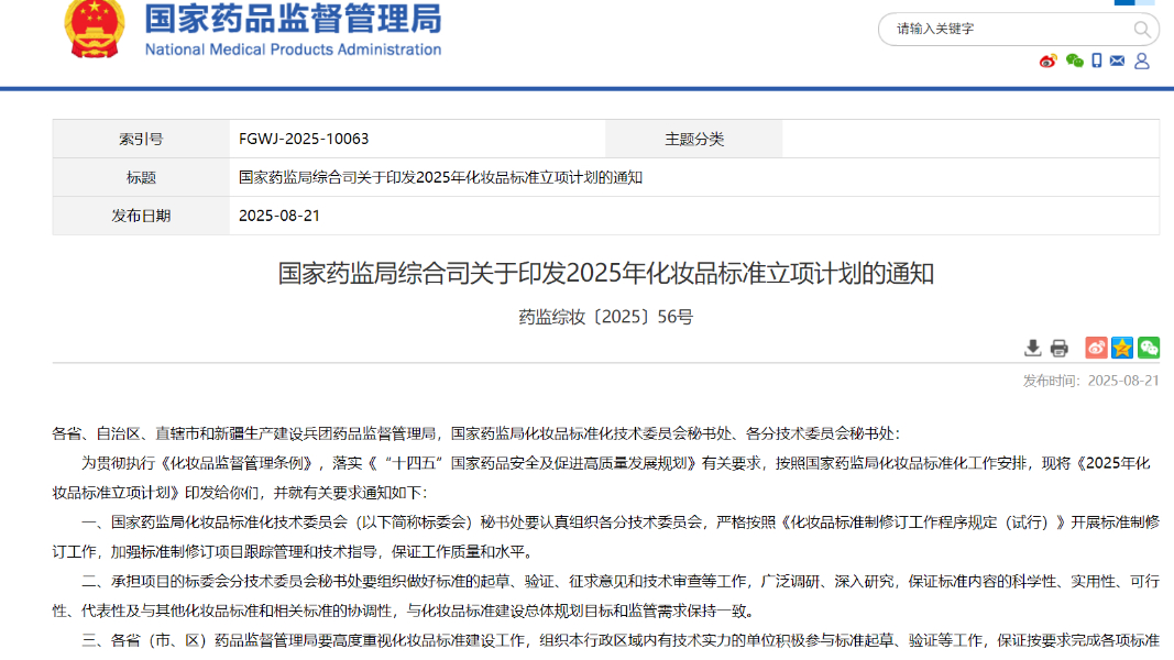 國家藥監(jiān)局綜合司關(guān)于印發(fā)2025年化妝品標(biāo)準(zhǔn)立項計劃的通知
