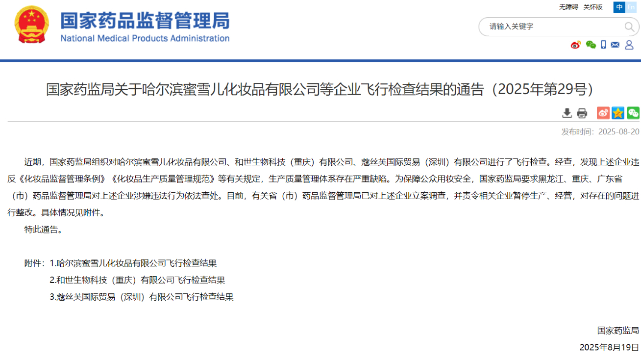 國家藥監(jiān)局關(guān)于哈爾濱蜜雪兒化妝品有限公司等企業(yè)飛行檢查結(jié)果的通告(2025年第29號)