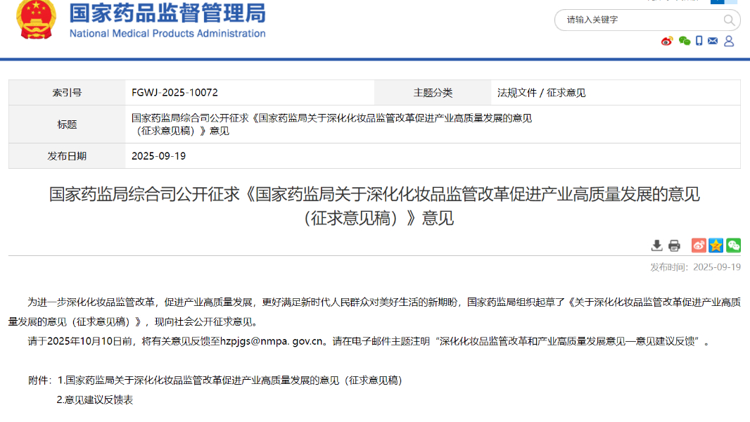 國家藥監(jiān)局綜合司公開征求《國家藥監(jiān)局關(guān)于深化化妝品監(jiān)管改革促進產(chǎn)業(yè)高質(zhì)量發(fā)展的意見(征求意見稿)》意見