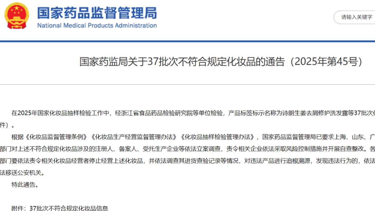 國家藥監(jiān)局關(guān)于37批次不符合規(guī)定化妝品的通告(2025年第45號)