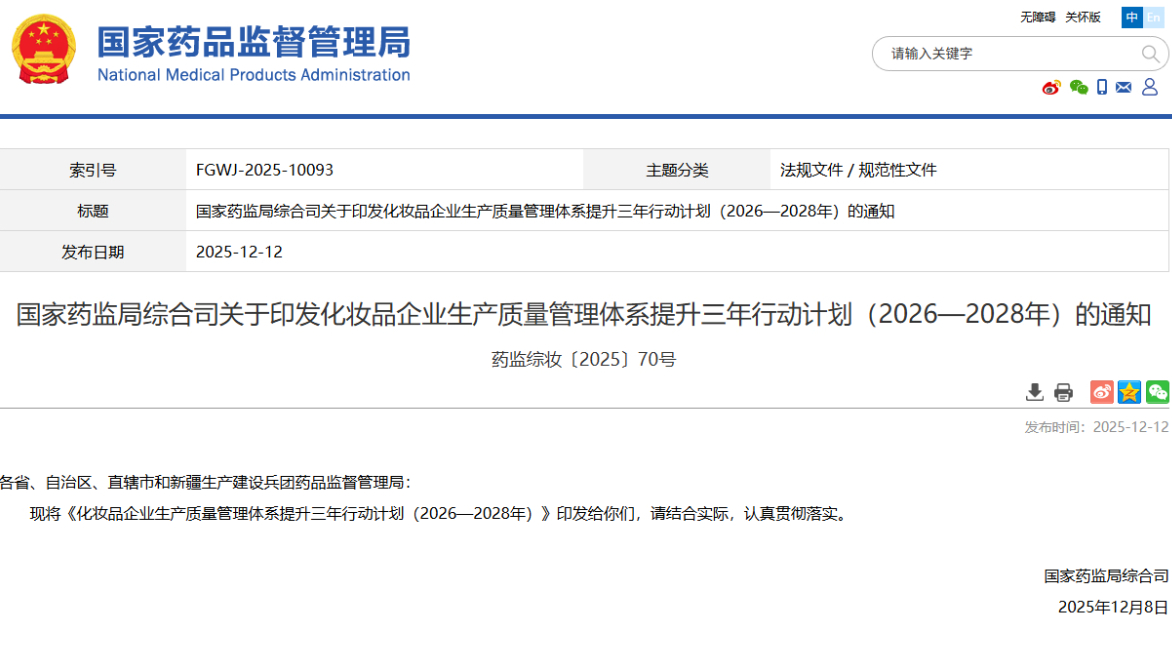國家藥監(jiān)局綜合司關(guān)于印發(fā)化妝品企業(yè)生產(chǎn)質(zhì)量管理體系提升三年行動計劃(2026—2028年)的通知 藥監(jiān)綜妝〔2025〕70號