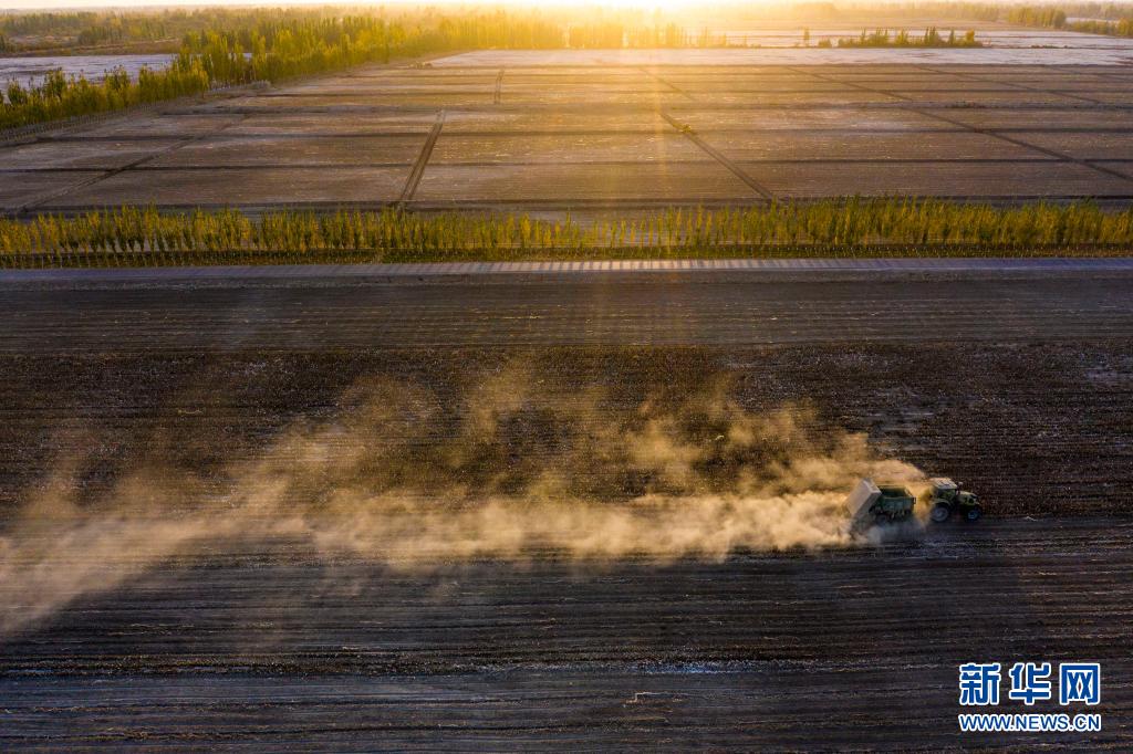 在新疆阿克蘇地區(qū)沙雅縣古勒巴格鎮(zhèn),農(nóng)用機(jī)械在一處采收完的棉田里進(jìn)行殘膜回收、秸稈粉碎還田作業(yè)(2020年10月23日攝,無(wú)人機(jī)照片)。阿克蘇地區(qū)沙雅縣地處塔里木盆地西北緣,是產(chǎn)棉大縣。近年來(lái),沙雅縣先后吸引棉紡、農(nóng)機(jī)制造、節(jié)水設(shè)備制造等多家企業(yè)落戶(hù)。