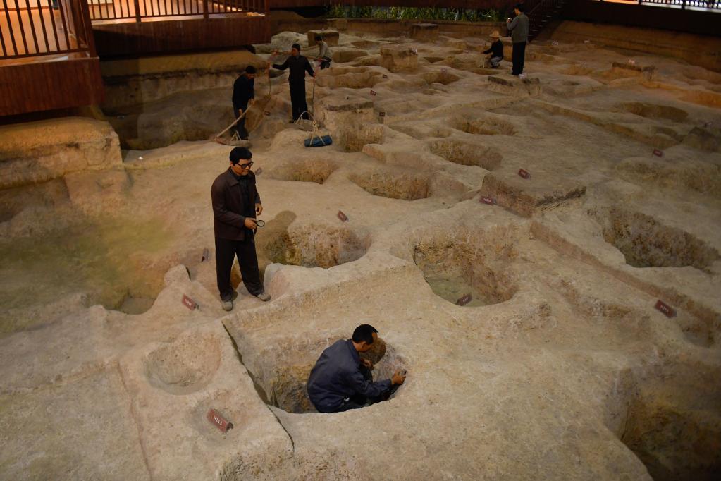這是上山考古遺址公園發(fā)掘原址上的考古情景再現(5月12日攝)。新華社記者 黃宗治 攝