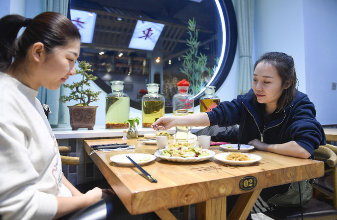 在四川省彭州市一家菜馆,食客使用公筷为朋友夹菜。新华社 罗国杨 摄