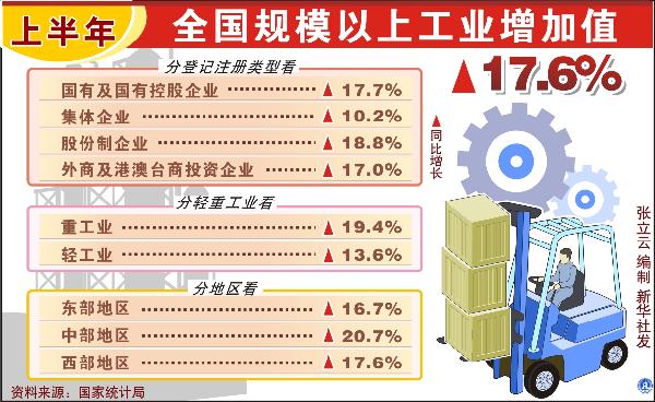 圖表:上半年全國規(guī)模以上工業(yè)增加值增加17.6%