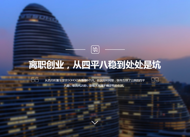 采訪臨近尾聲,天色已晚。但張偉與他的團(tuán)隊(duì)似乎并沒有結(jié)束工作的打算。與他們告別后,走在SOHO大樓間的小道上,看著那一間間仍在挑燈奮戰(zhàn)的格子間,不禁感慨,一年后或者數(shù)年后,有多少人會(huì)還在這里堅(jiān)持?有多少人會(huì)選擇新的出發(fā)點(diǎn)?又有多少人會(huì)幸運(yùn)地突出重圍?