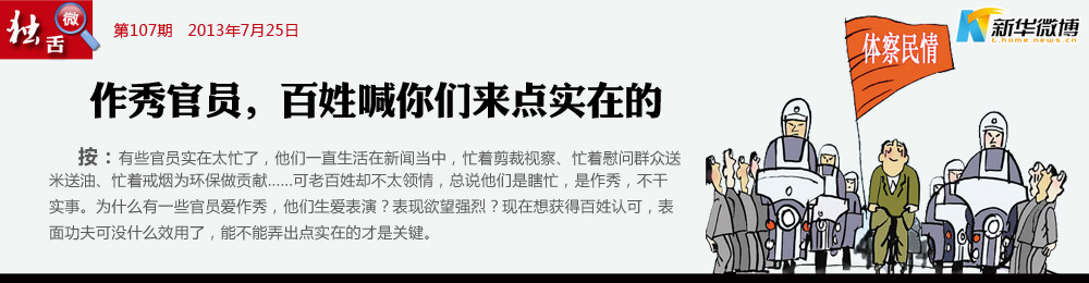 讓群眾開心? 讓領(lǐng)導(dǎo)開心:作假;讓同級開心:作啞;讓群眾開心:作秀。作秀,不會讓群眾開心,卻會嚴(yán)重?fù)p害執(zhí)政黨的威信,消費(fèi)黨的信譽(yù)。