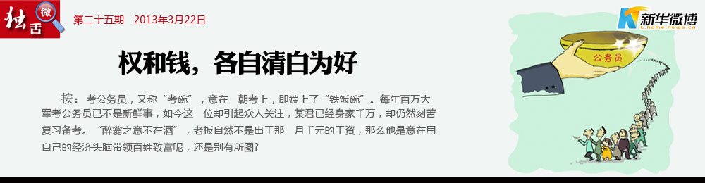 如果千萬(wàn)富翁考上公務(wù)員 千萬(wàn)富翁考公務(wù)員折射的是某些政府部門“門難進(jìn)、事難辦”的現(xiàn)狀,也反映出當(dāng)下企業(yè)的生存無(wú)奈。假設(shè)他有朝中舉,好的結(jié)果是政府吸納了一名懂經(jīng)濟(jì)的得力干將,壞的結(jié)果則是又多出一個(gè)亦官亦商的“紅頂商人”。