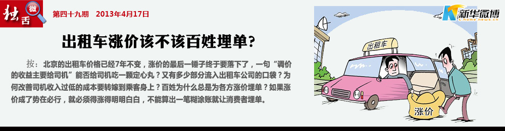 一粬:需考慮全國(guó)人民的感受 反對(duì)出粗車漲價(jià),北京出租車漲價(jià)的理由居然是根據(jù)北京居民和工薪階層工資上漲幅度為理由,確實(shí)是特權(quán)利益階層短視經(jīng)不起推敲的謬見,北京是全體國(guó)家公民一生中最少去一次的城市,所有窗口行業(yè)的收費(fèi)確實(shí)不只是一個(gè)城市的小事情,須思考全國(guó)人民的感受。