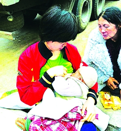 女志愿者為孤兒哺乳 網(wǎng)友劉守龍和朋友帶著救援物資去蘆山縣的途中,記錄了這感人的一幕。照片中哺乳的紅衣女子是成都趕來的志愿者。嬰兒的奶奶表示,四個月大的嬰兒已經(jīng)兩天沒有喝奶了,嬰兒的母親在地震中已被倒塌房屋壓死。紅衣女子得知后便把孩子抱來喂奶。