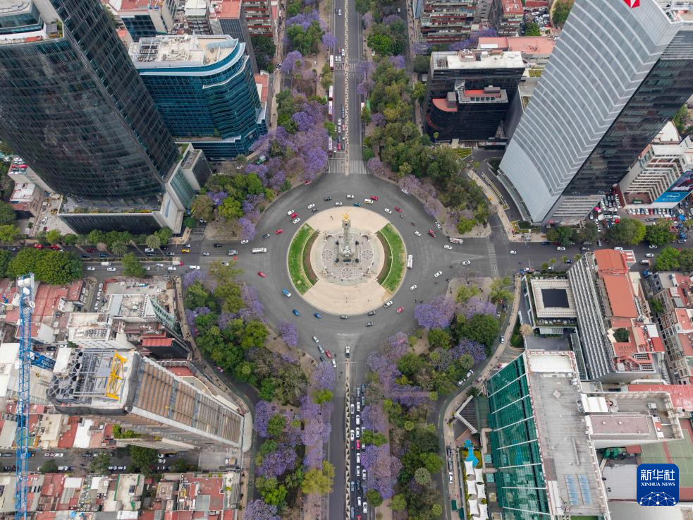 这是3月24日在墨西哥首都墨西哥城改革大道拍摄的蓝花楹(无人机照片)。