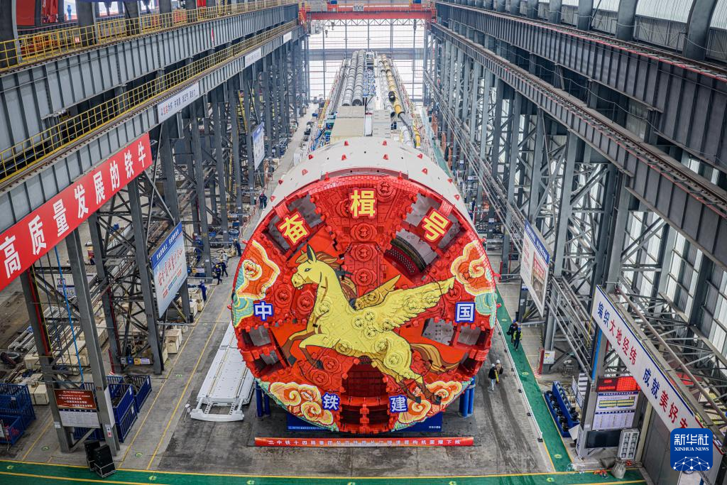 3月31日,由中国铁建打造的一台国产14米级超大直径盾构机“奋楫号”在江苏南通顺利下线,将被用于新建盐城经泰州、无锡、常州至宜兴高铁长江隧道工程(无人机照片)。