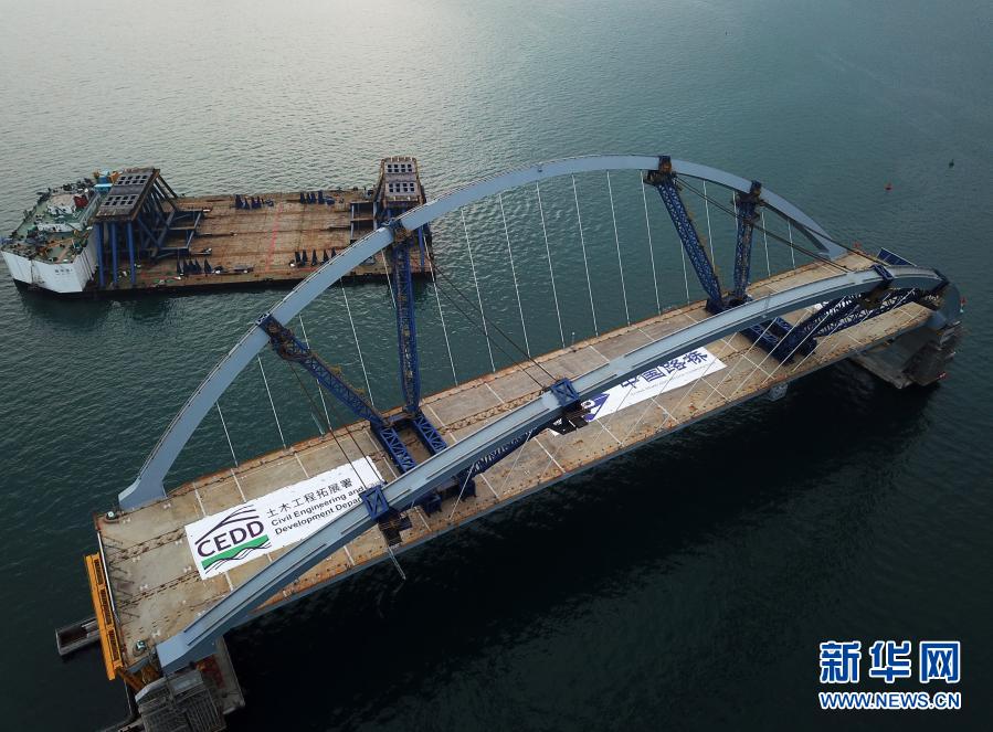 2月26日,從早晨7時開始,歷時5個小時,首次利用海潮漲落的“浮托法”,70多位現(xiàn)場施工人員經(jīng)過緊張調(diào)試,將內(nèi)地預(yù)制好的雙拱鋼橋精準對接并安裝在橋墩上。