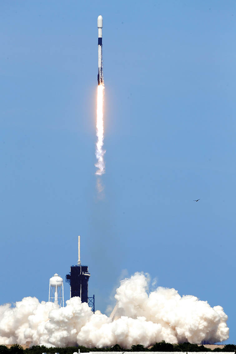 美国太空探索技术公司2020年4月22日用一枚“猎鹰9”火箭将“星链”计划第7批60颗卫星送入太空。图为当天“猎鹰9”火箭从美国佛罗里达州卡纳维拉尔角空军基地升空
