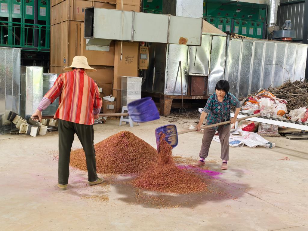 村民正在付鹏程的家庭农场拌种。新华社记者 田中全 摄