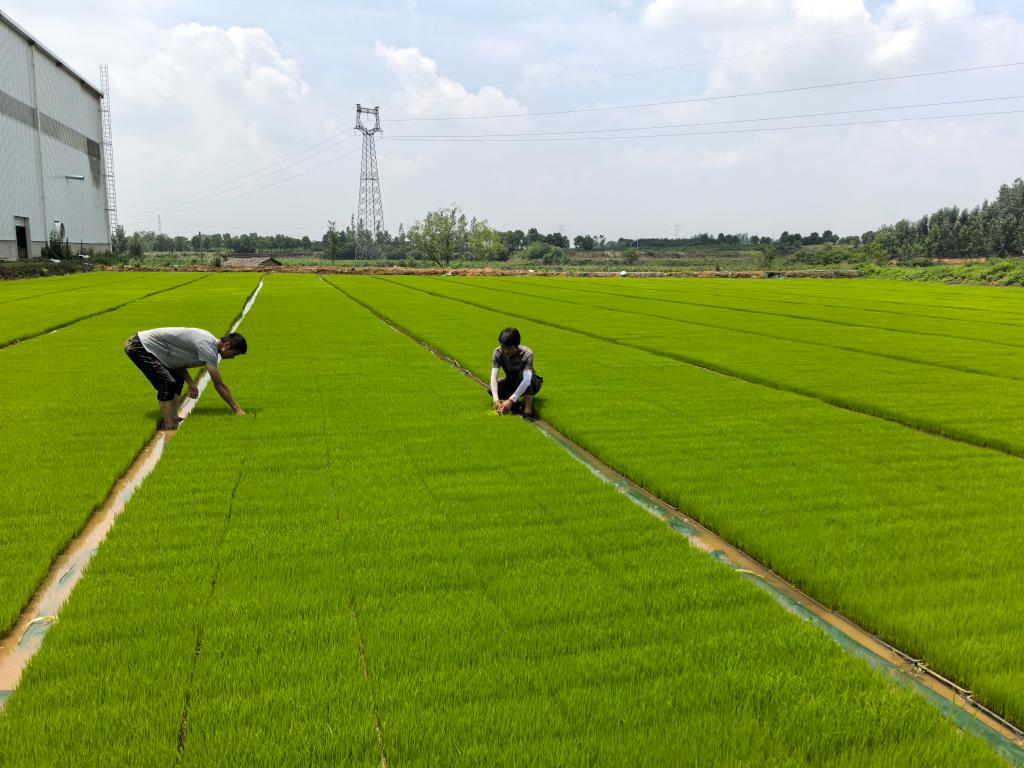 新华社武汉6月21日电(记者田中全)盛夏时节,水稻育秧正忙。在湖北省孝昌县邹岗镇群爱村,成片的秧盘铺成碧毯。41岁的“新农人”付鹏程挽起裤管,趿着凉鞋踩进秧田,每走几步便俯身从水里抓起一把太子稻秧苗仔细查看。“你看这根须像蛛网一样密,长得比往年都壮实,再养几天就能插秧了。”