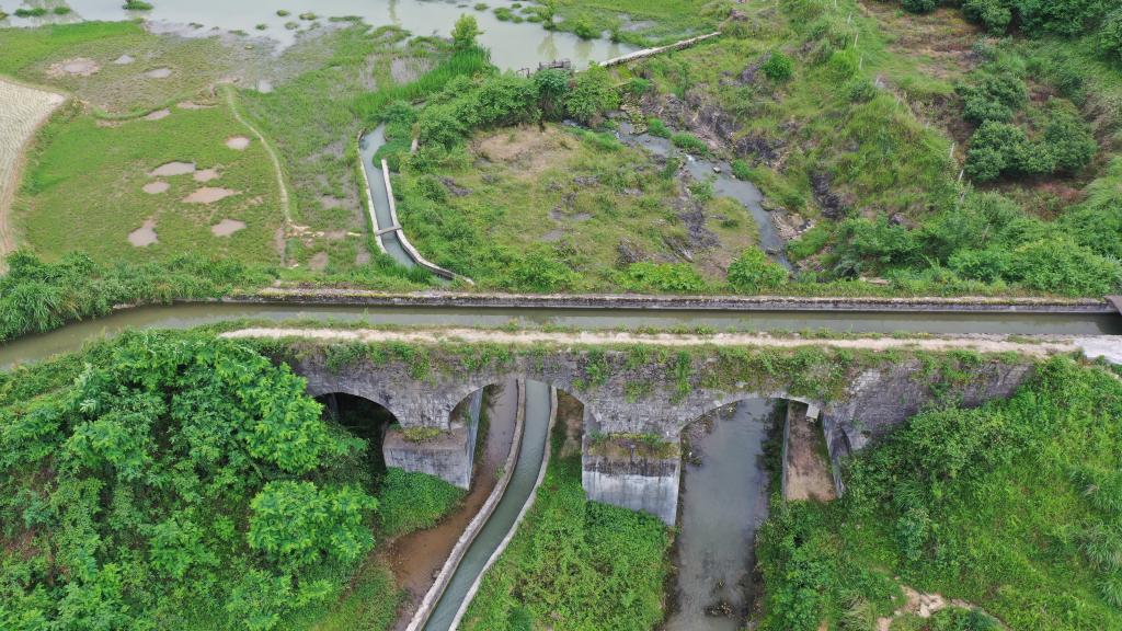 其中,最具特色的是在三拱桥渡槽处,古人利用地形高差形成的独特“三层立交”奇观。作为这座百年古堰的核心枢纽,三拱桥是目前中国现存年代最早、规模最大且仍在使用的古代砌石结构渡槽。巨丰堰、永丰堰与平江河支流正是在此呈“立交”分布。